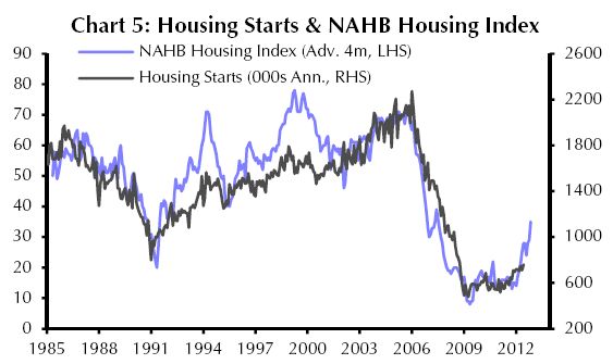 Ein klarer Lichtblick bei der Beurteilung der amerikanischen Wirtschaftslage ist die Situation am Häusermarkt. Hier hat die steigende Anzahl der Hausverkäufe und eine Erholung der Preise einen positiven Einfluss auf die Bauwirtschaft insgesamt. Der vorlaufende Charakter des NAHB Homebuilders Index lässt erwarten, dass die Zahl der Neubaubeginne noch weiter deutlich zulegt und die 1 Million-Grenze erreichen kann.