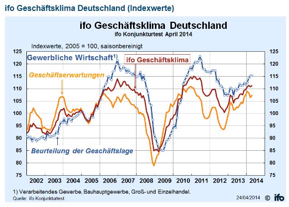 Der ifo Geschäftsklimaindex für die gewerbliche Wirtschaft in Deutschland ist im April auf 111,2 Punkte gestiegen. Das ifo Geschäftsklima ist einer der wichtigsten Frühindikatoren zur Beurteilung der konjunkturellen Entwicklung in der Bundesrepublik. Er basiert auf ca. 7.000 monatlichen Befragungen von Unternehmen des verarbeitenden Gewerbes, des Bauhauptgewerbes, des Großhandels und des Einzelhandels.