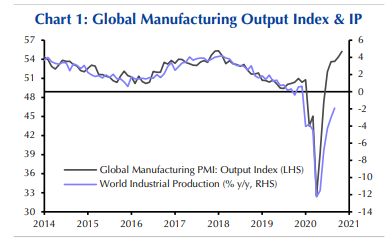 Der PMI (Purchasing Manager Index = Einkaufsmanagerindex) für das globale verarbeitende Gewerbe (manufacturing sector) stieg im November im siebten Monat in Folge. Die Beeinträchtigungen des November-Lockdowns, vor allem in Europa, belasten die Industrie bei weitem nicht so stark wie im März und April 2020.