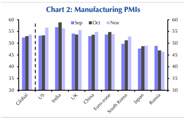 Der globale PMI des verarbeitenden Gewerbes stieg im November auf ein Niveau von 53,7 (nach 53 im Oktober), dies ist der höchste Stand seit Februar 2018. Der Caixin manufacturing PMI in China erreichte im November mit 54,9 sogar ein 10-Jahres-Hoch. Auch wenn der Wert für Indien im Vergleich zum Rekordmonat Oktober leicht rückläufig war, signalisieren die Umfragedaten eine Fortsetzung des Erholungspfades. Starke PMI Daten in Taiwan und Korea bestätigen die insgesamt gute Situation in Asien.