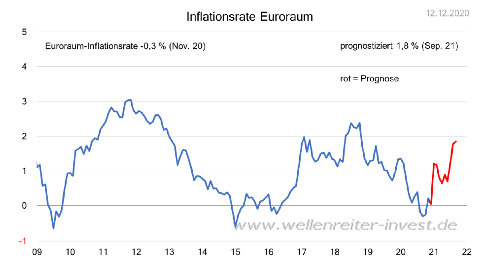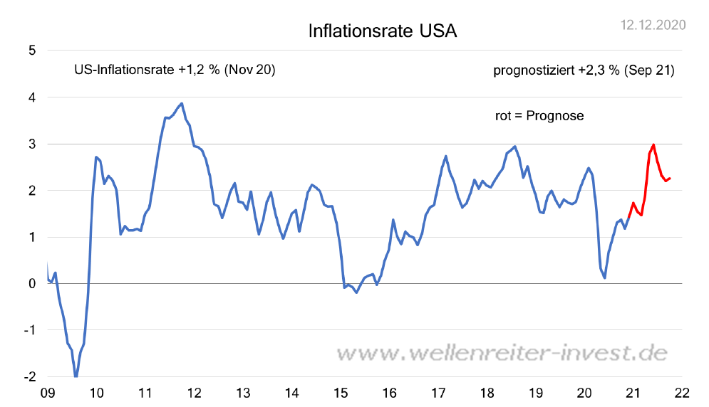 Wenn es glingt, durch Impferfolge und Medikamente zur Behandlung von Covid-19, die Pandemie komplett und dauerhaft unter Kontrolle zu bekommen, dann ist ein ausgesprochen kräftiges globales Wirtschaftswachstum im Jahresverlauf 2021 (und 2022) sehr wahrscheinlich. Dies würde mit hoher Wahrscheinlichkeit zu einem Anstieg der Inflation führen, wie in den beiden nachfolgenden Grafiken dargestellt.