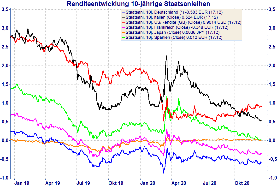 Da die US-Notenbank bis zumindest Ende 2022 eine Erhöhung der Leitzinsen ausgeschlossen hat, werden die Zinsen im kurzen Laufzeitenbereich im Jahr 2021 auf dem tiefen Niveau verharren. Auch die EZB und die BoJ werden die Zinsen sehr lange extrem tief halten. Allerdings ist dies keine Garantie dafür, dass bei längeren Laufzeiten der Kapitalmarkt nicht zeitweise seinen eigenen Weg geht.