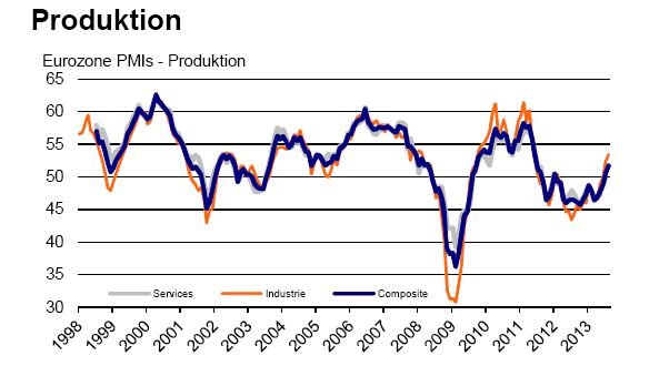 In der Bundesrepublik stieg der Composite-Index um 1,3 auf 53,4 Punkte, wobei insbesondere die Industrie kräftig zulegte. Hier stieg der entsprechende Index um 1,5 auf 55,3 Punkte. Auch im Dienstleistungsbereich ergaben sich Fortschritte; der Aktivitätsbarometer dieses Sektors gewann 1,1 auf 52,4 Zähler hinzu. Diese Frühindikatoren lassen darauf schließen, dass im driten Quartal 2013 das BIP kräftig wachsen könnte.