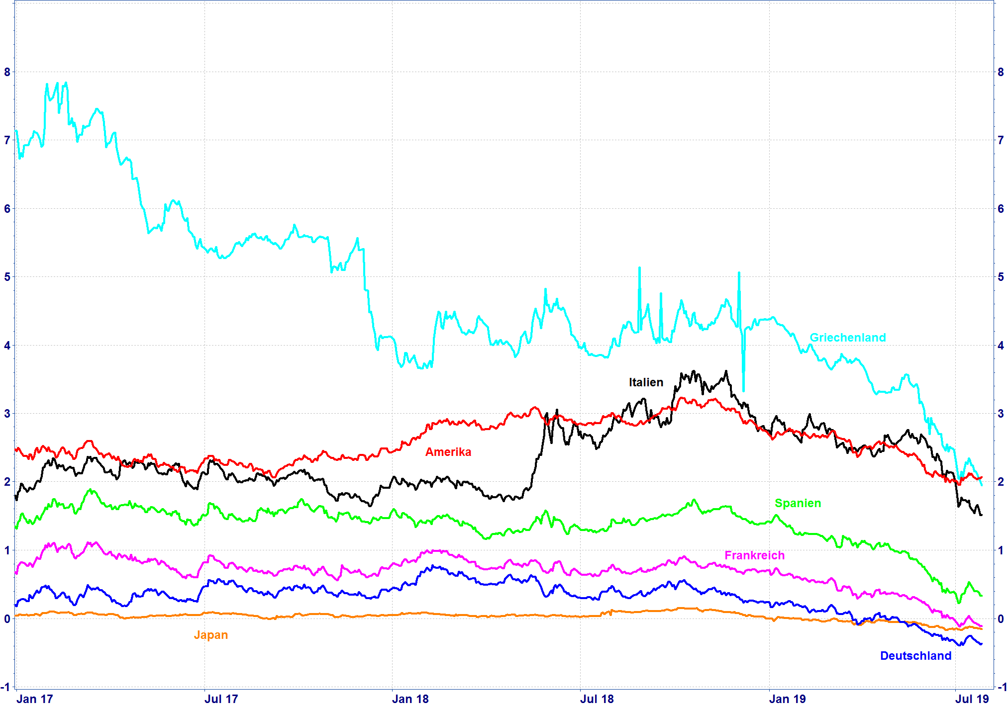 Die Grafik illustriert die Renditeentwicklung diverser 10-jähriger Staatsanleihen seit Jahresbeginn 2017