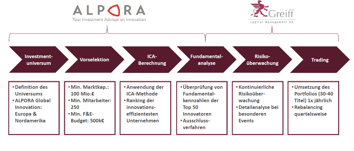 Zwischen der ALPORA AG und der Greiff AG erfolgt eine Aufteilung des Investmentprozesses wie das nachfolgende Schaubild verdeutlicht: