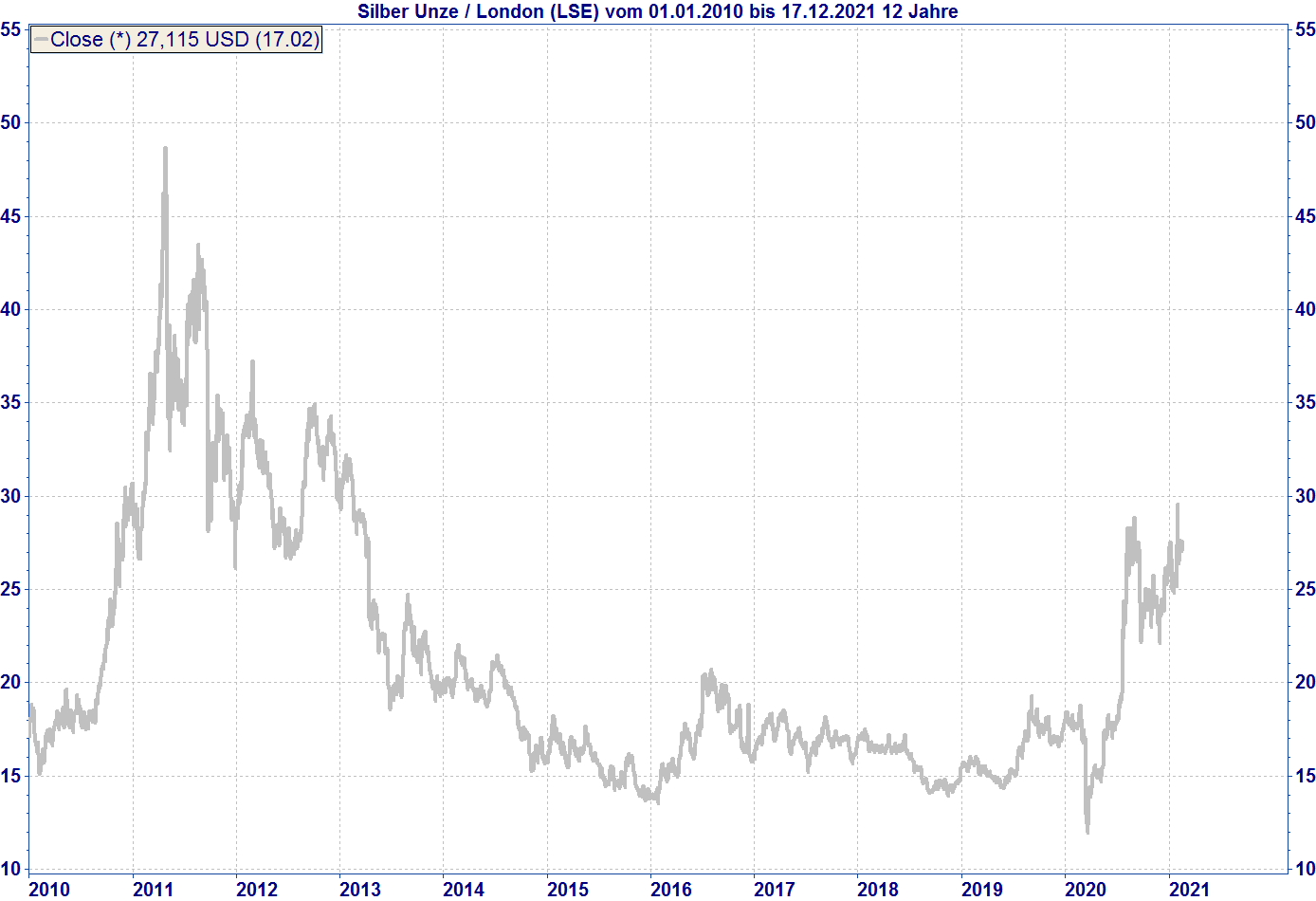 Es besteht kaum Zweifel, dass die industrielle Nachfrage nach Silber – auch durch die Biden-Initiative – steigen wird. Es wäre deshalb nicht überraschend, wenn sich Silber als einer der Top-Performer der Assetklassen in den nächsten Jahren herausstellt. Aktuell müht sich der Silberpreis an der Überwindung der 30 Dollar-Marke. Sollte dies gelingen, dann könnten zunächst 35 Dollar je Unze und im weiteren Verlauf auch das Niveau von rund 50 Dollar (der Topkurs aus dem Jahr 2011) möglich sein.