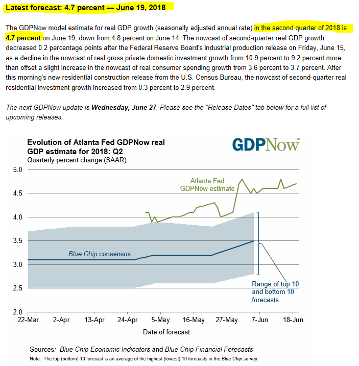 Diese Einschätzung erweist sich als absolut zutreffend, denn im zweiten Quartal 2018 stiegen die Konsumausgaben der US Bürger kräftig an. Die Steuererleichterungen und weiter steigende Einkommen befeuerten die wirtschaftlichen Aktivitäten deutlich. Die Prognosen für das GDP-Wachstum (Gros Domestic Product – Bruttoinlandsprodukt) im zweiten Quartal gehen deutlich über die 4%-Marke hinaus. Unsere treuen Leser kennen bereits das GDP Now Modell der Atlanta Fed. Dieses Modell signalisiert aktuell ein Wirtschaftswachstum im Quartal von sage und schreibe 4,7%!