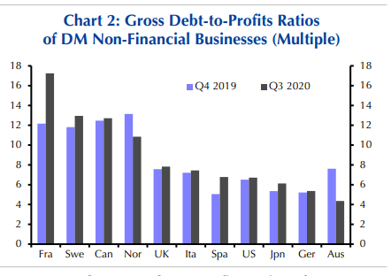 Im Verlauf der C-19 Pandemie wurde, mit einem Verweis auf die steigende Unternehmensverschuldung, die Gefahr einer bevorstehenden Pleitewelle heraufbeschworen, die den Aufschwung zunichte machen könnte. Die Verschuldung von Unternehmen außerhalb des Finanzsektors in den entwickelten Ländern stieg in den ersten drei Quartalen 2020 von 42 Billionen Dollar auf über 44 Billionen Dollar an.