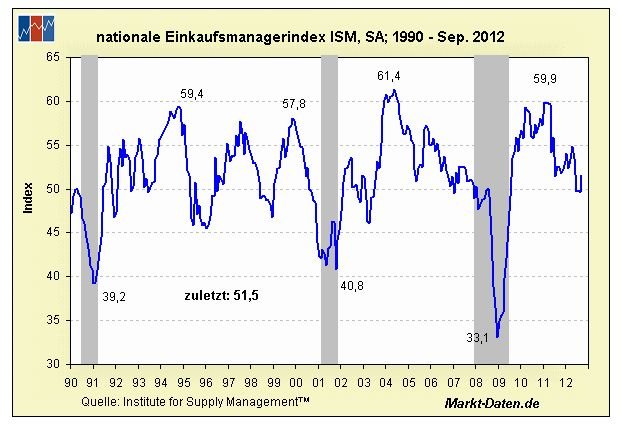 Den Anfang machte der ISM Manufacturing Index (ISM = Institute for Supply Management) am vergangenen Montag, der mit 51,5 für den September (August 49,6) ein vier-Monats-Hoch erreichen konnte. Dieser Anstieg nährt Hoffnungen, dass die schwächere Entwicklung in den Monaten Juni bis August 2012 als saisonales „Sommerloch“ zu werten ist. Als besonders positiv fielen die guten Beiträge der Sektoren „Auftragseingänge“, mit einem Anstieg von 47,1 im August auf 52,3 im September und „Beschäftigung“ mit einem Plus auf 54,7 im September nach 51,6 im August auf. Das ISM veröffentlicht diesen Index monatlich; er basiert auf der landesweiten Befragung von mehr als 400 Einkaufsmanagern, die 20 verschiedene Bereiche des verarbeitenden Gewerbes repräsentieren.