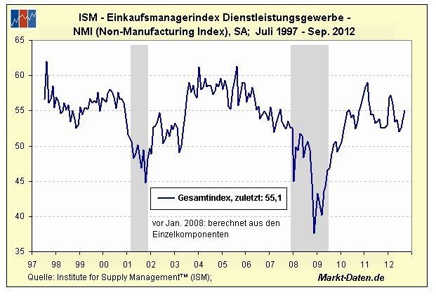 Die Septemberzahlen der beiden ISM-Indizes deuten für die USA eine Wachstumsbeschleunigung im dritten und vierten Quartal 2012 an. Sollten sich die oben genannten Daten in den Monaten Oktober bis Dezember fortsetzen, dann sollte ein annualisiertes US-Wirtschaftswachstum im Bereich 2 bis 2,5 Prozent möglich sein.