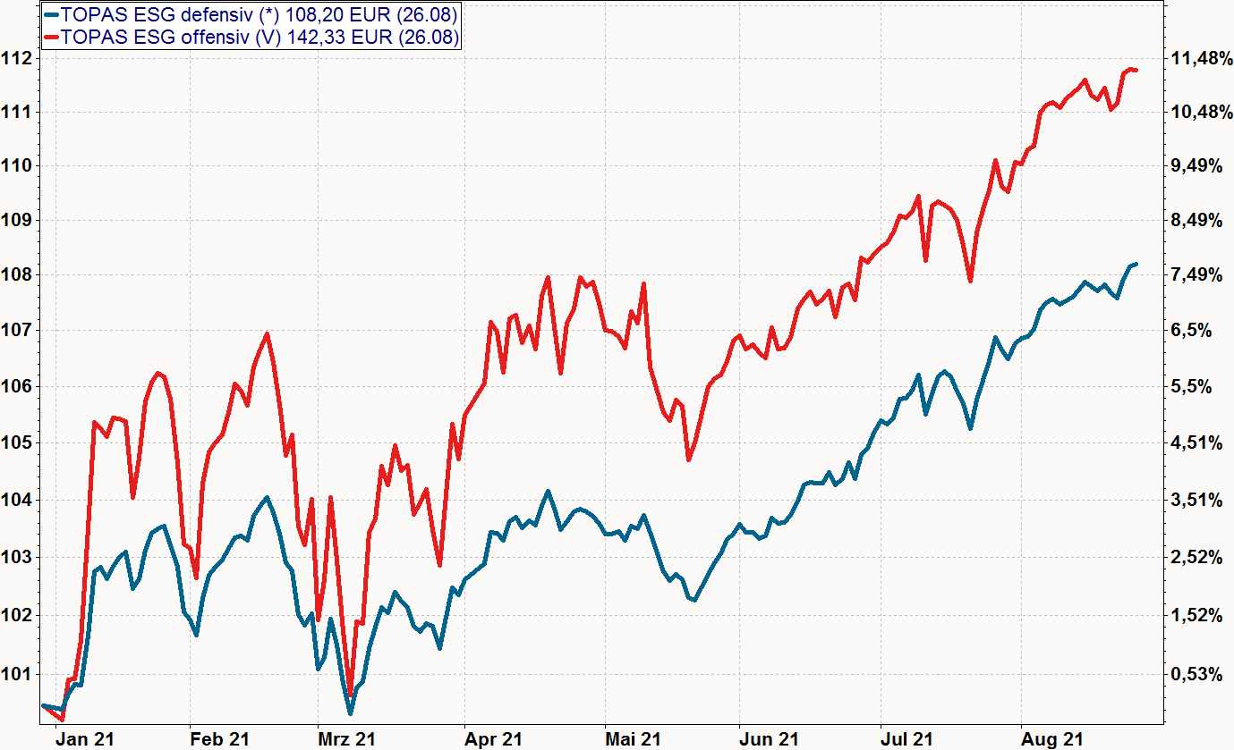 Das man mit dem Thema Nachhaltigkeit wirtschaftlich erfolgreich sein kann, zeigt sich auch in unserer Vermögensverwaltung. Unsere Beiden ESG Strategien: TOPAS ESG defensiv und TOPAS ESG offensiv konnten im bisherigen Jahresverlauf einen Wertzuwachs in Höhe von 7,69% bzw. 11,33% erzielen.