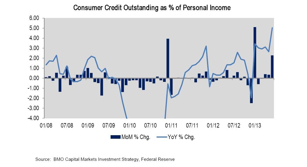 Auch die für die amerikanische Wirtschaftsentwicklung so wichtigen Konsumenten bringen ihre Zuversicht (sichere Arbeitsplätze, höhere Einkommen) mit einer Ausweitung der kreditfinanzierten Ausgaben zum Ausdruck. Die blauen Balken illustrieren die Monatsveränderungen, die hellblaue Linie die jährliche Veränderungsrate jeweils in Relation zum persönlichen Einkommen.