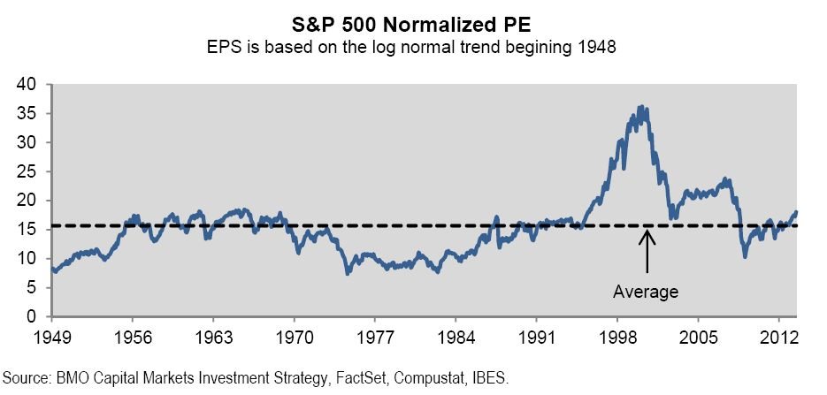 Der marktbreite S&P 500 Index konnte seit Jahresbeginn 19% zulegen. Das ist unbestritten eine beeindruckende Performance und bewertet die dargelegten soliden makroökonomischen Faktoren in Amerika und natürlich die gute fundamentale Situation der US-Unternehmen. Allerdings beinhalten diese Kurse auch ein Stück der positiven Zukunftserwartungen. Wie der nachfolgende Chart illustriert ist die Bewertung (gemessen am Kurs/Gewinnverhältnis = PE) der im S&P 500 enthaltenen Aktien nach den zurückliegenden Kursavancen bereits leicht über dem Durchschnitt der vergangenen 63 Jahre.