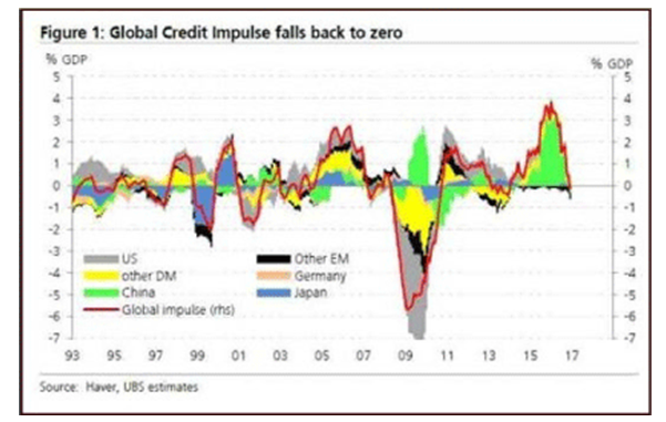 Globaler Kreditimpuls sinkt an die Nulllinie. Erstmals seit ihrer Gründung in 1913, steht die Fed nun mit heruntergelassenen Hosen da. Sie hat ihre Bilanz auf 4,5 Billionen Dollar aufgebläht und hält die Zinsen seit fast einem Jahrzehnt an der Nulllinie. Das bedeutet: Kommt die nächste Rezession, ist die Fed weder zu stimulierenden Zinssenkungen, noch zu einem Bailout in der Lage. Aus ihrer Zwickmühle heraus, in die sich die Fed selbst hinein manövriert hat, versucht sie nun die Zinsen anzuheben, um in der nächsten Krise noch irgendwie handlungsfähig zu sein.