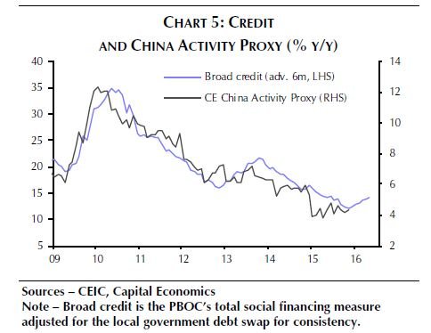 Die blaue Linie zeigt das Volumen der Kreditvergabe in China (linke y-Achse, 6 Monate in die Zukunft verschoben), die schwarze Linie bildet den China Activity Proxy von Capital Economics ab.