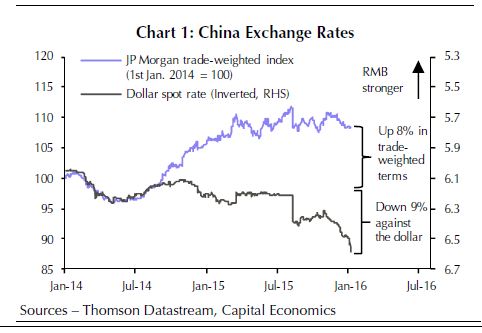 Die blaue Linie zeigt den Verlauf des handelsgewichteten Renminbi seit 2014. Die schwarze Linie die Entwicklung des Renminbis zum US Dollar.