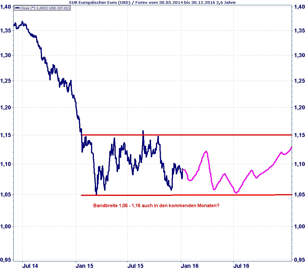 Die große Aufwertungsbewegung des Dollars gegenüber dem Euro dürfte der Vergangenheit angehören. Eine weitere Stärkung des Dollars, nicht nur gegen den Euro sondern auch gegen den Yen, liegt eindeutig nicht im Interesse der Amerikaner. Allerdings sehen wir zunächst in 2016 noch keine deutliche Umkehrung dieser Entwicklung. In der nachfolgenden Grafik wagen wir den Versuch einer Prognose bis Ende 2016.