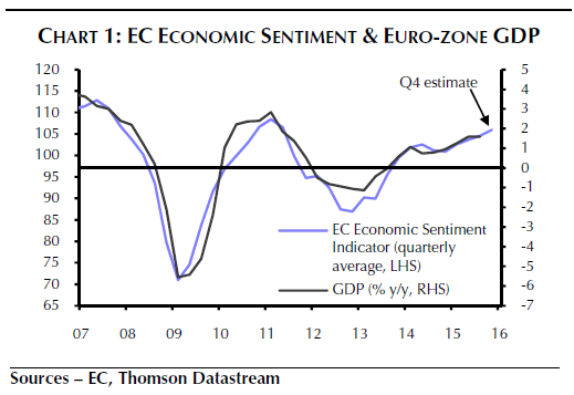 Die blaue Linie bildet den Stimmungsindikator in der Eurozone ab. Die schwarze Linie zeigt die Entwicklung des BIP. Zeitraum 2007 bis 2016.