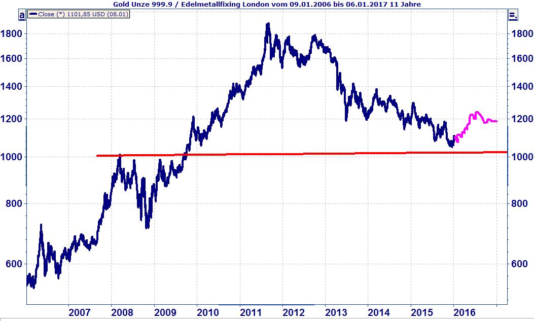Die blaue Linie bildet die Entwicklung des Goldpreises in Dollar je Unze von Anfang 2006 bis aktuell ab. Die magendafarbene Linie stellt eine Prognose bis Jahresende 2016 dar.