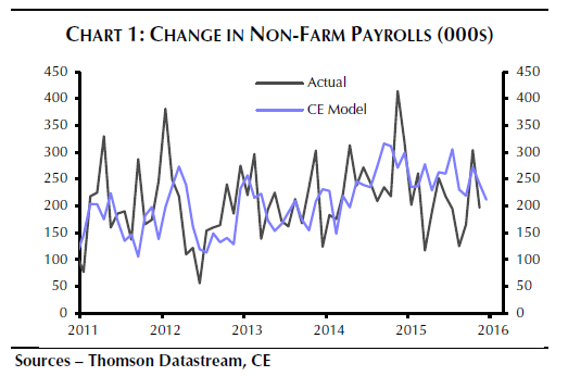 Die schwarze Linie zeigt die Entwicklung der monatlich neue geschaffenen Stellen ex Agrar seit 2011 – +292.000 im Dezember 2015 fehlen noch. Die blaue Linie die Modell-Zahlen von Capital Economics.
