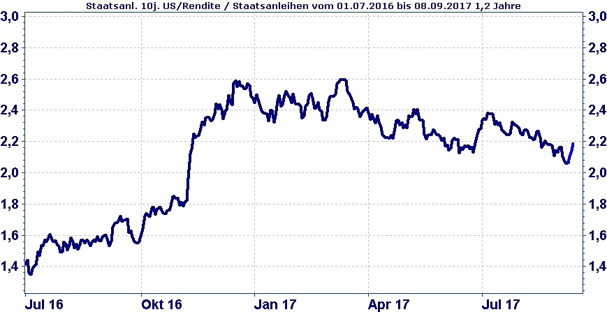 Mit großem Interesse schauen wir in diesen Tagen auf die Ereignisse in den USA und das nicht nur wegen der verheerenden Wirbelstürmen die in der Karibik, in Texas und nun in Florida große Schäden anrichteten. Diese Naturkatastrophen werden die wirtschaftliche Entwicklung kurzfristig vermutlich etwas bremsen (Unterbrechung der Lieferketten). Mittel- und langfristig möglicherweise mit den notwendigen Wiederaufbaumaßnahmen sogar konjunkturfördernd wirken. Es ist die Zinsentwicklung, die seit geraumer Zeit nicht so recht ins Bild passen will!